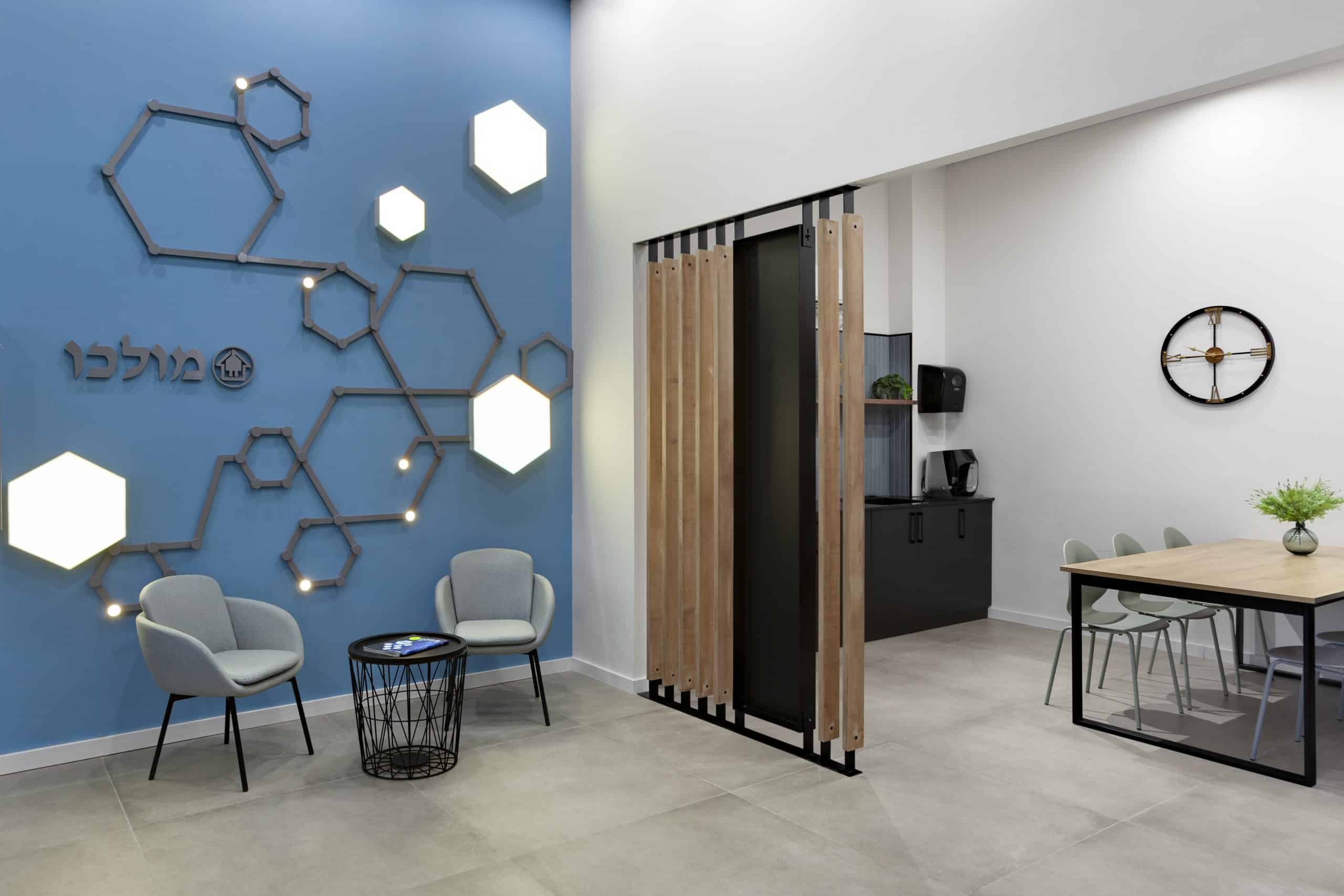 אחד הדברים האהובים אלינו בחברה היא לקבל פרויקטים מהסוג זה, פרויקטים אשר העיצוב, המחשבה מעבר והמקצועיות הם הקווים המנחים. לאחר חודשים ארוכים של מחשבה ועבודה קשה הגענו לקו הסיום עם המשרדים החדשים של חברת מולכו, לא התפשרנו לרגע. רשימת המוצרים: שולחנות: שולחן ישיבות דגם CASA שולחן עבודה דגם A כיסאות: כיסא עבודה מעוצב דגם 6832 כיסא אורח דגם 9118B כיסא אורח דגם 5059 שידת: שידת מגירות שולחנית מחיצות: מחיצות על שולחניות (בהזמנה אישית) משרד אדריכלים: נתי זיו צילום: ניצן הפנר